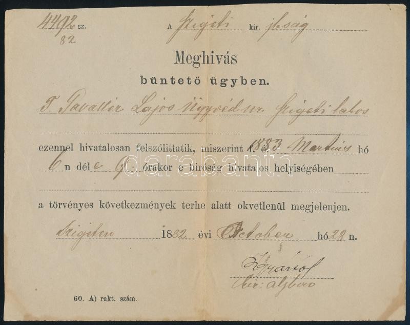 Leírás: 1882 "Meghívás büntető ügyben", bírósági felszólítás büntetőtárgyaláson való megjelenésre ügyvéd részére