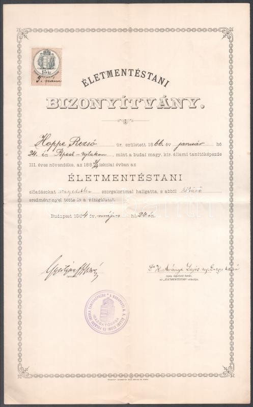 Leírás: 1884 Életmentéstani bizonyítvány, pecséttel, aláírásokkal, 15 kr okmánybélyeggel.