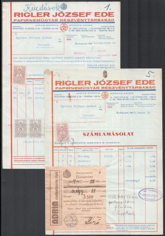 cca 1860-1936 össz. 7 db fejléces, többségében díszes számla: Weiner A. & Grünbaum férfi ruha tára, Kántor Tamás műasztalos (2 db), Rigler József (2 db), Orient Pótkávégyár, Hoffmann Ferencz (levél). Hajtásnyommal, kisebb szakadásokkal, részben foltos