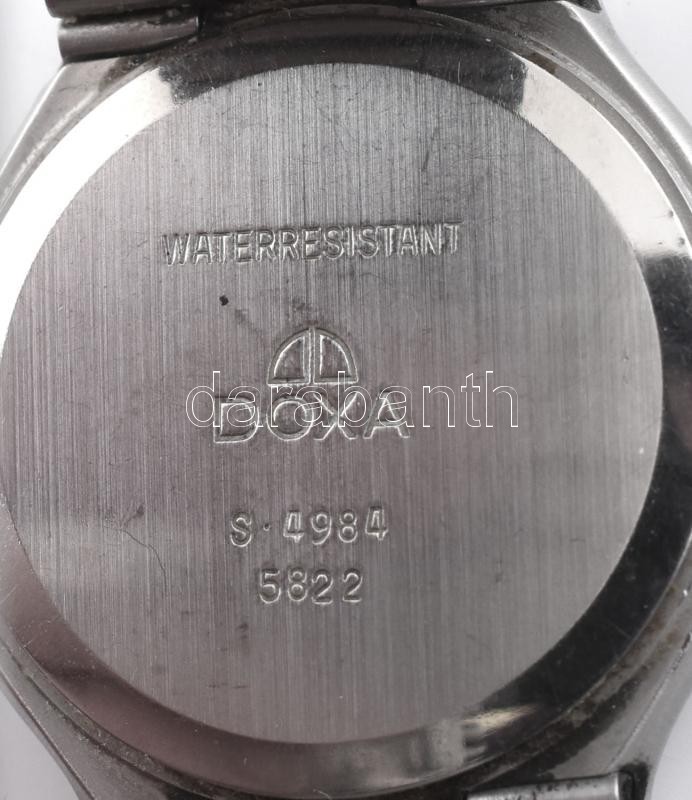 Leírás: Doxa másodpercutatós, dátumkijelzős kvarc karóra, fém szíjjal, dobozban, kopásnyomokkal, d: 3,2 cm