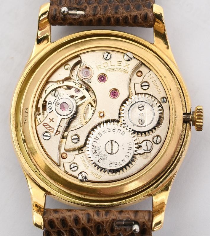 Rolex precision kézi felhúzós 18K arany férfi karóra. Jelzett tok, jelzett 17 köves szerkezet, friss szervizzel, új bőr szíjjal. karcmentes, nagyon szép állapotban / Rolex 18 C gold manual wind men's watch. Works well. perfect condition d: 30 mm