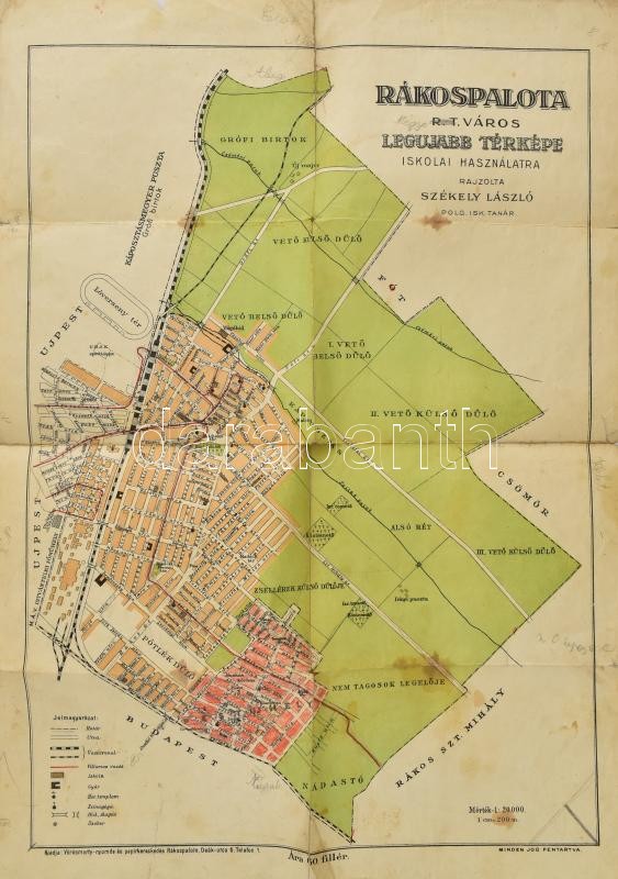 Rákospalota r.t. város legújabb térképe iskolai használatra, rajzolta: Székely László, 1:20 000, kiadja: Vörösmarty Nyomda, szakadással, foltos, 50×35 cm