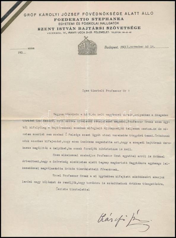 1933 gróf Károlyi József (1884-1934), a Foederatio Stephanea Egyetemi és Főiskolai Hallgatók Szent István Bajtársi Szövetsége fővédnökének aláírt levele, fejléces levélpapíron