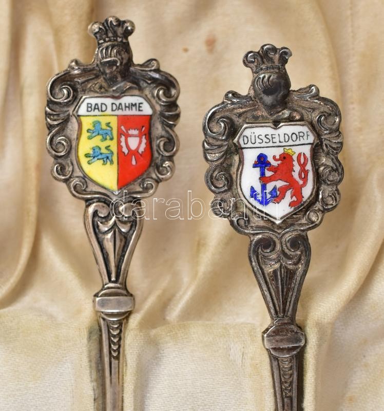 6 db ezüst (Ag) emlékkanál zománc berakással (Berlin, Chur, Bad Wiessee, Insel Mainau, Bad Dahme, Düsseldorf), Düsseldorf kivételével jelzett, kopott vászonborítású dobozban, br. 59 g, h: 10 és 11 cm között.