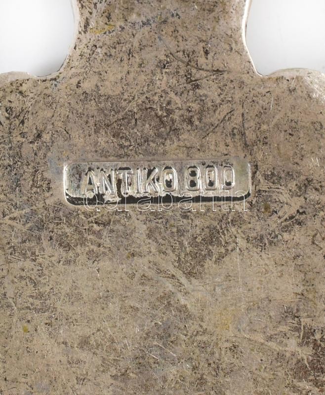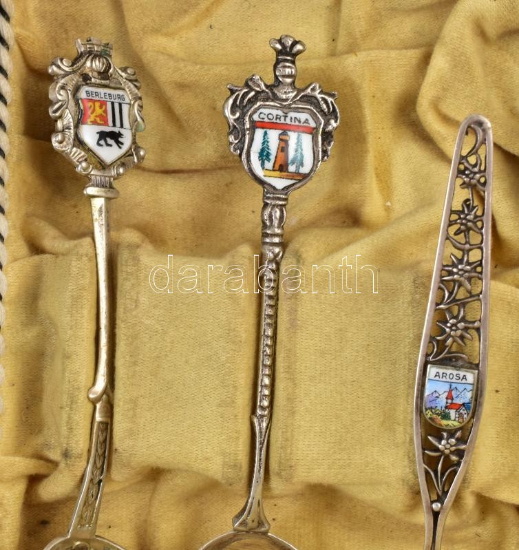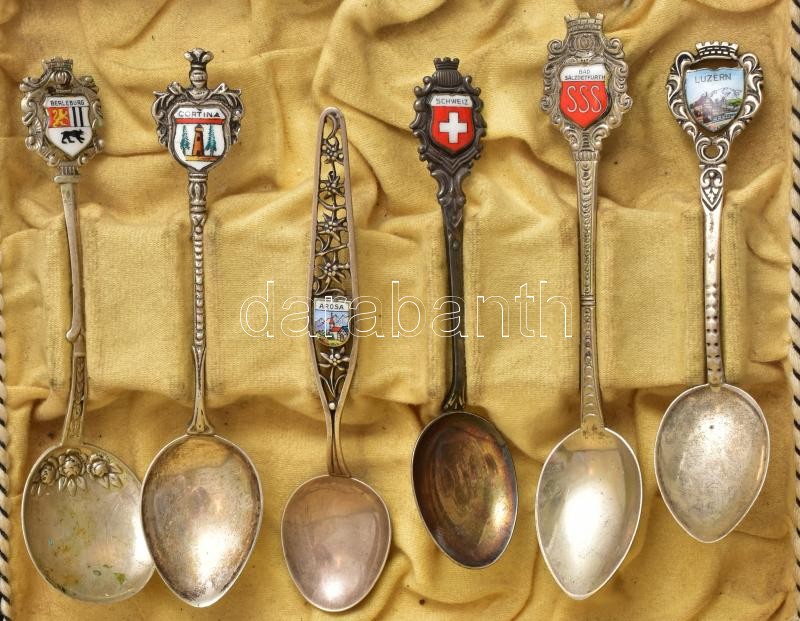 6 db ezüst (Ag) emlékkanál zománc berakással (Schweiz, Luzern, Cortina, Arosa stb.), jelzett, kopott vászonborítású dobozban, br. 62 g, h: 9,5 és 11,5 cm között.