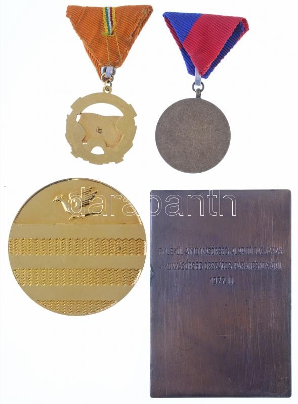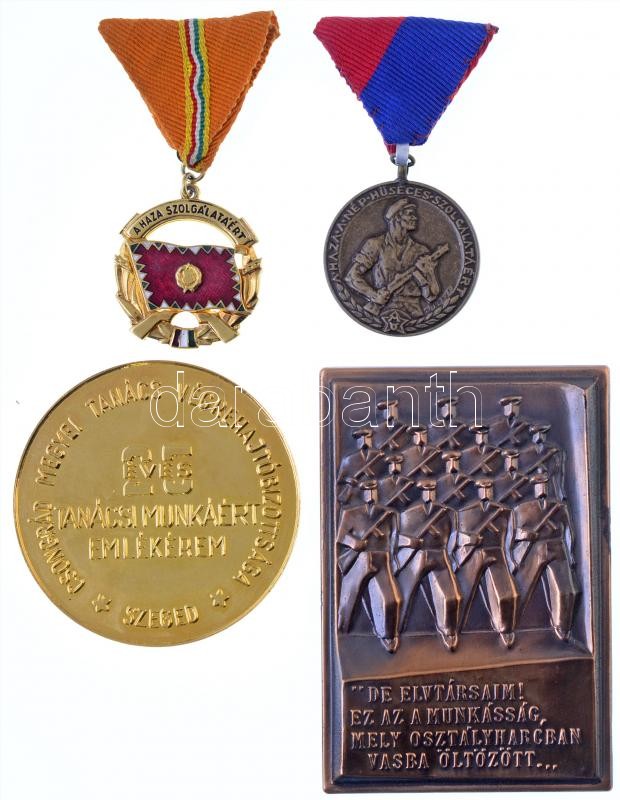 4db-os szocialista plakett és kitüntetés tétel, közte: Kiss Nagy András (1930-1997) 1977. "De elvtársaim! Ez az a munkásság, mely osztályharcban vasba öltözött... / Emlékül a MunkásÅ‘rség alapÃtó tagjának a MunkásÅ‘rség országos parancsnokától 1977. II." vörösréz emlékplakett eredeti tokban (104,5x72mm), 1964. "A Haza Szolgálatáért Érdemérem arany fokozat" zománcozott aranyozott Br kitüntetés + ~1960-1970. "MunkásÅ‘r" Br kitüntetés, szalagon, miniatűrrel szalagsávon, eredeti tokban T:1-,2