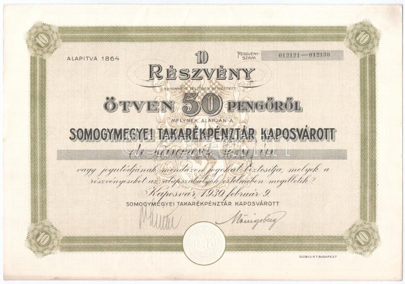 Leírás: Kaposvár 1930. "Somogymegyei Takarékpénztár Kaposvárott" részvénye 50P-ről szelvényekkel, szárazpecséttel T:II-