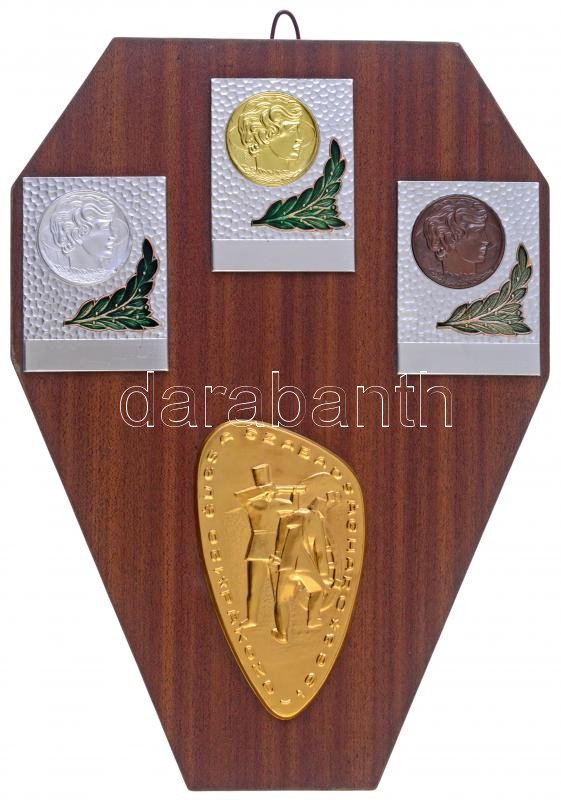 1968. "120 éves a szabadságharc - Pákozd - 1968" fém lemezplakett (~115x68mm) + 3xklf fém díjplakett első, második és harmadik helyezett számára (55x75mm), mind a 4db plakett egy fából készült alaphoz rögzítve, amely akasztóval rendelkezik (~210x290x21mm) T:1-