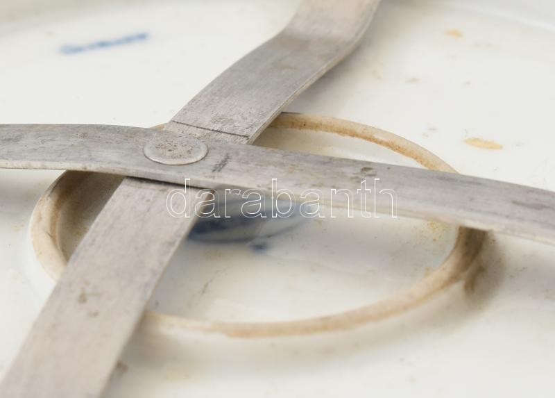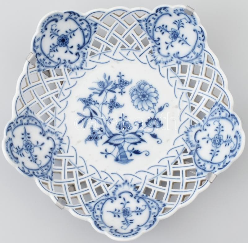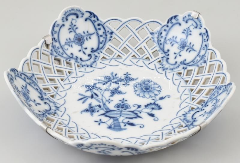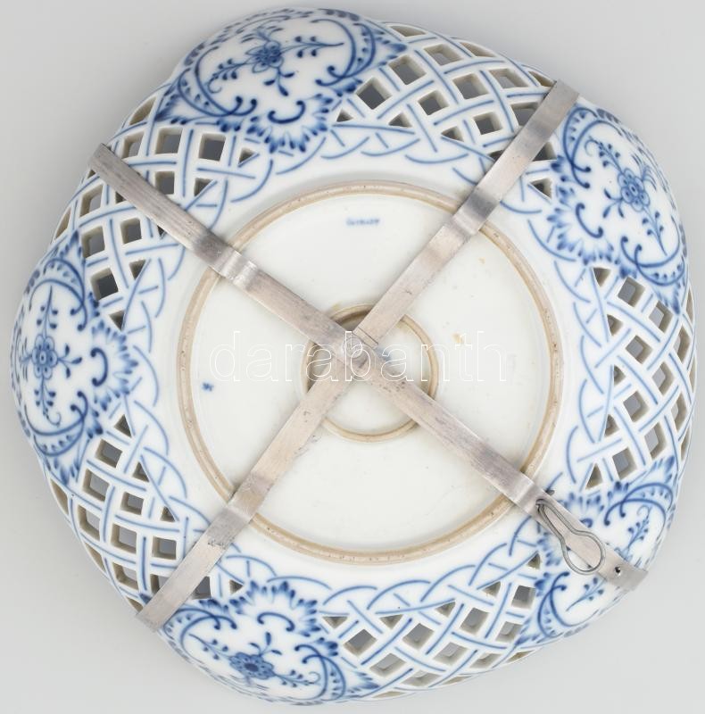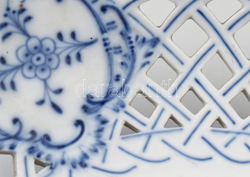 Meisseni porcelán áttört fali dísztál, virágmintás, máz alatti kék festéssel. Jelzett, kis kopásokkal, apró repedésekkel. Falra akasztáshoz fém tartóval. d: 28 cm
