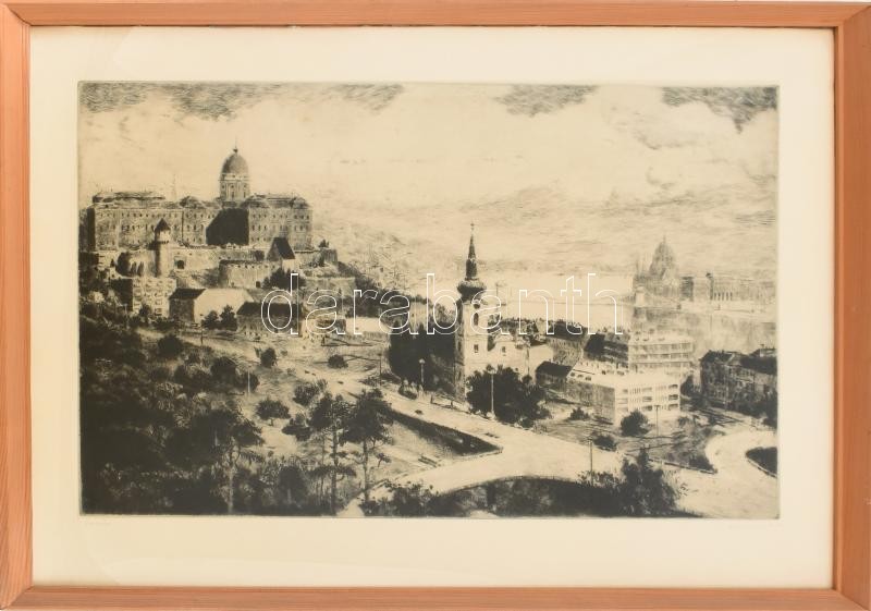 Leírás: Konecsni Zsizsi (1911-2000): Tabán. Rézkarc, papír, jelzett, üvegezett fa keretben, 46x73 cm