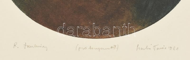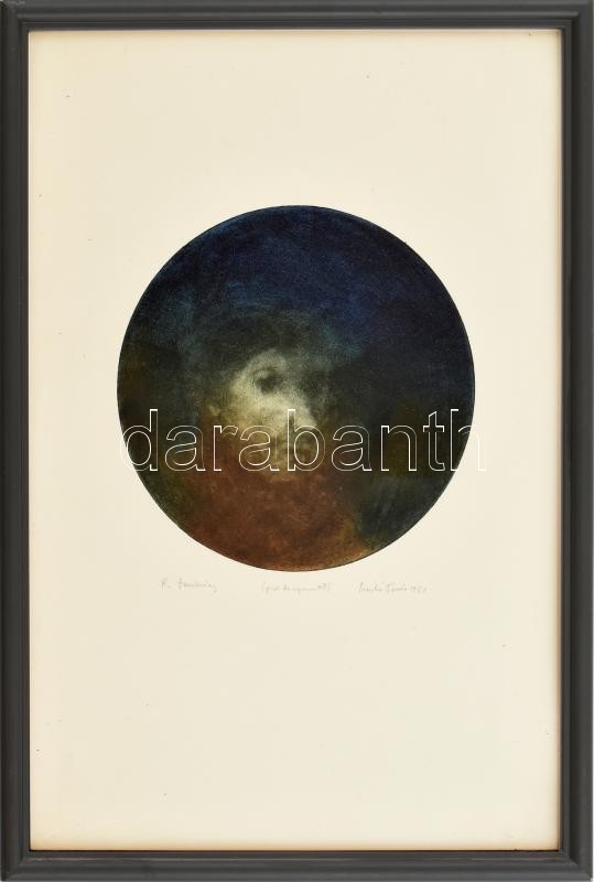 Leírás: Szabó Tamás (1952-): R. tanulmány, 1981. Színes rézkarc, papír, jelzett. Üvegezett fa keretben. d: 15 cm