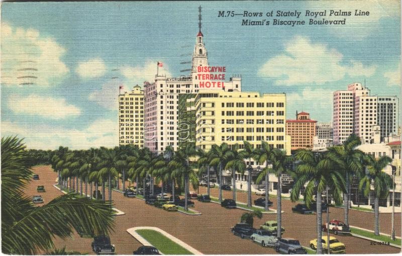 Leírás: 1953 Miami (Florida), rows of stately royal palms line, biscayne boulevard, automobiles, Biscayne Terrace Hotel