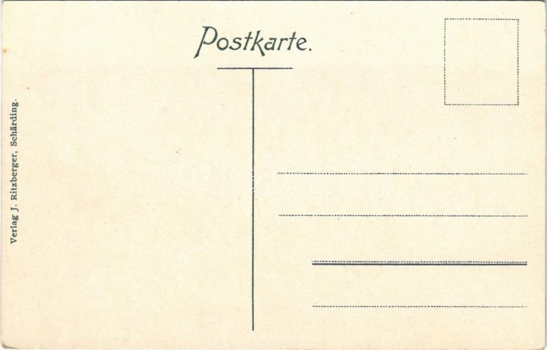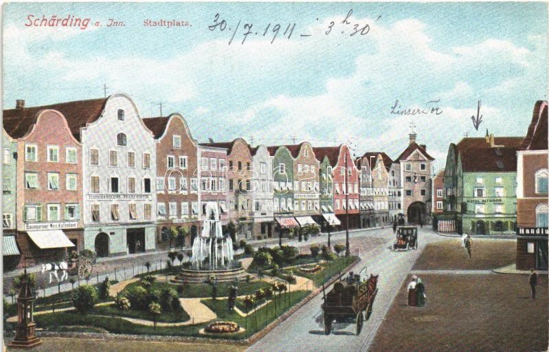 1911 Schärding a. Inn, Stadtplatz, Hotel Altmann, Eisenhandlung Franz Pinter, Baumgartner Wein Kaffeehaus / square, shops, hotel, wine hall and cafe, automobile