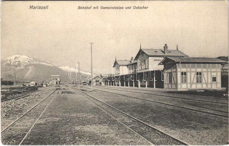Leírás: 1918 Mariazell, Mariazellerbahn Bahnhof mit Gemeindealpe und Ötscher / railway station