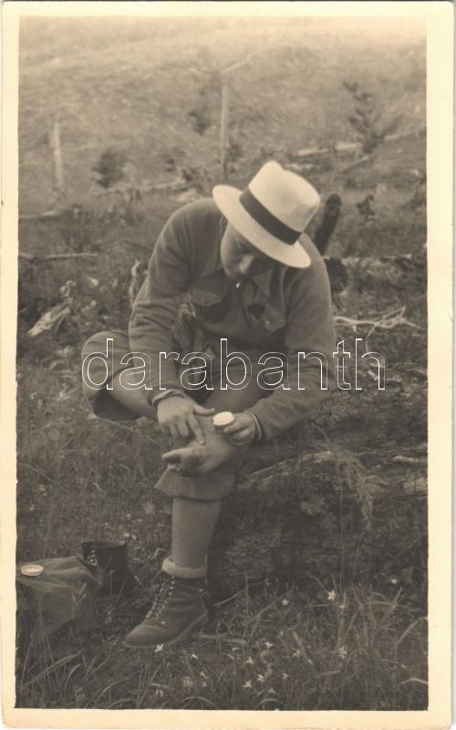 Leírás: Cserkész a bakanccsal feltört lábát ápolja / Hungarian boy scout with injured foot. photo (vágott / cut)
