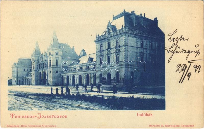 Leírás: 1899 (Vorläufer) Temesvár, Timisoara; Józsefváros indóház, vasútállomás. Bernárd E. fényképész és Králicsek Béla kiadása / Iosefin, railway station