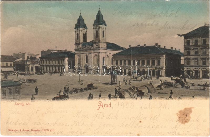 Leírás: 1903 Arad, Tököly tér, templom, Hoffmann József, ifj. Löwy Ármin, Schwarz R., Goszif Miklós üzlete, piac / square, shops, market