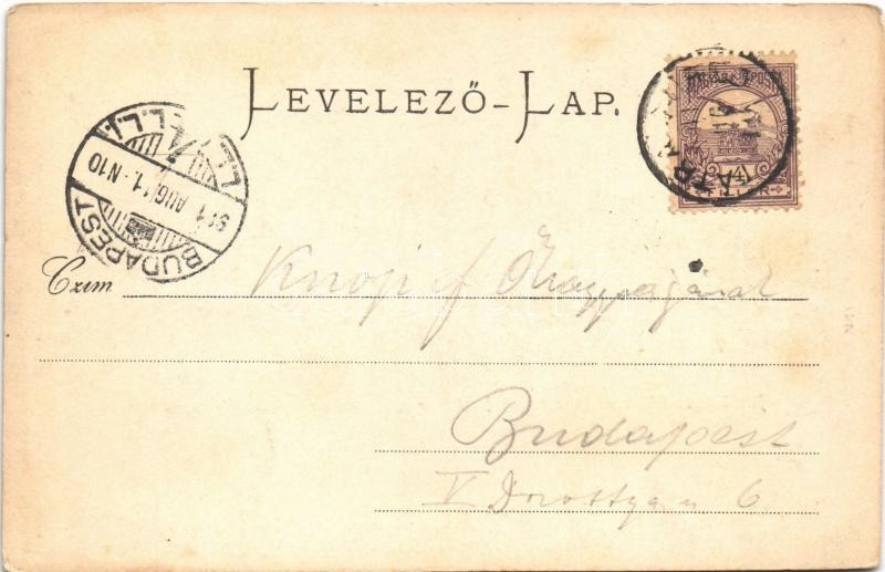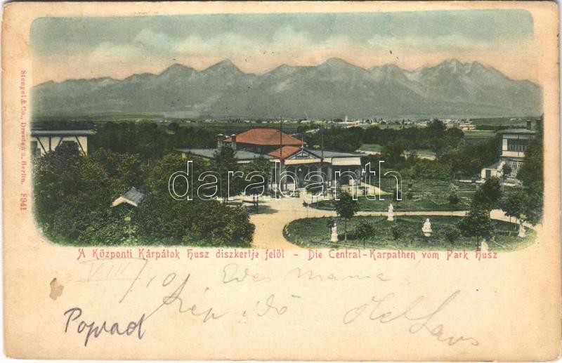 1901 Tátra, Magas-Tátra, Vysoké Tatry; Központi Kárpátok a Husz park díszkertje felől, kávéház / Die Central-Karpathen vom Park Husz / Carpathian Mountains, park, café (fl)