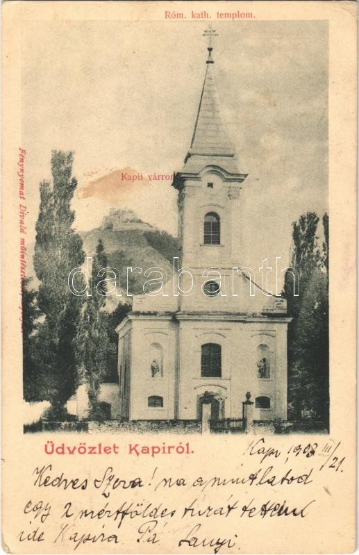 Leírás: 1903 Kapi, Kapusany; római katolikus templom, várrom. Divald / church, castle ruins (EK)