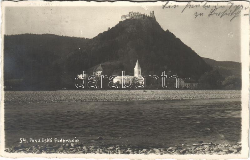 Leírás: 1936 Vágváralja, Vág-Podhragy, Povazské Podhradie (Vágbeszterce, Povazská Bystrica); Podrágyvár, templom, kastély, Vágvölgy / castle, church in Váh Valley / Povazie. Foto-Tatra (Trencín)