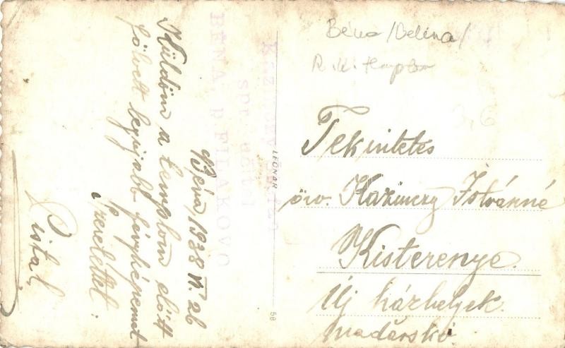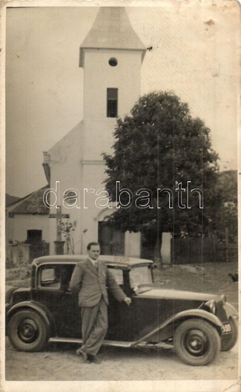 1938 Béna, Belina; férfi automobillal a római katolikus templom előtt / man with automobile next to the Catholic church. Kazinczy Stefan photo (kis szakadás / small tear)