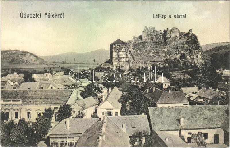 Leírás: Fülek, Filakovo; látkép a várral, szálloda, Klesz Márton üzlete. W.L. Bp. 5962. / castle, hotel, shop