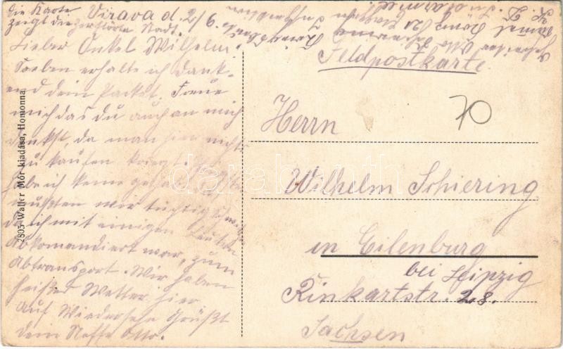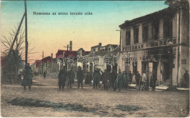 Homonna, Homenau, Humenné; Fő tér romokban az oroszok betörése után, Friedmann Markus üzlete, az orosz invasio után. Waller Mór kiadása / WWI destroyed main square after the Russian offensive, shops, ruins