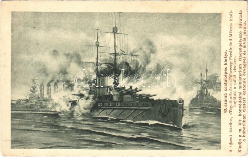 40. számú csataképes kártya. A Szent István, Tegetthoff és a Főherceg Ferdinánd Miksa hadihajóink a polai vizeken. A M. kir. Honvédelmi Minisztérium Hadsegélyező Hivatala kiadása / WWI Austro-Hungarian Navy art postcard, K.u.K. Kriegsmarine, SMS Szent István, SMS Tegetthoff, SMS Erzherzog Ferdinand Max in Pula (EK)