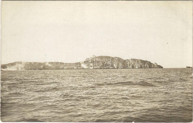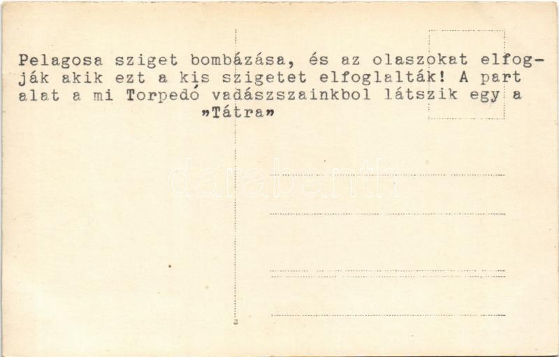 "Pelagosa sziget bombázása, és az olaszokat elfogják, akik ezt a kis szigetet elfoglalták! A part alatt a mi torpedóvadászainkból látszik egy, a Tátra" Osztrák-Magyar Haditengerészet K.u.K. partraszállási akció Pelagosa szigeténél, a világítótorony bombázása / K.u.K. Kriegsmarine's invasion of the island of Palagruza, bombardment of the lighthouse, SMS Tátra torpedo destroyer. photo