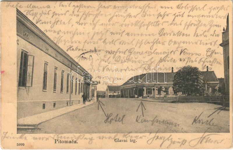 1905 Pitomacsa, Pitomaca; Fő tér, szálloda, üzlet / Glavni trg / main ... https://www.darabanth.com/hu/395-Gyorsarveres/395.0/Kepeslapok/Horvatorszag~1000009/1905-Pitomacsa-Pitomaca-Fo-ter-szalloda-uzlet-Glavni-trg-main-square-hotel-shop~II2399192