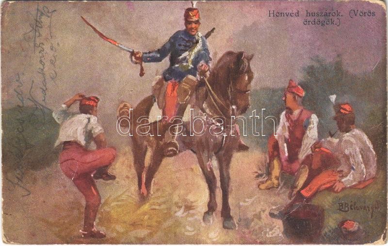 Leírás: 1915 Honvéd huszárok (Vörös ördögök) / WWI Austro-Hungarian K.u.K. military art postcard, hussars. B.K.W.I. 889-2. s: B. Bélaváry (ázott sarok / wet corner)