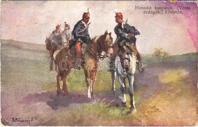 Leírás: 1915 Honvéd huszárok (Vörös ördögök) előőrsön / WWI Austro-Hungarian K.u.K. military art postcard, hussars. B.K.W.I. 889-6. s: B. Bélaváry (EK)