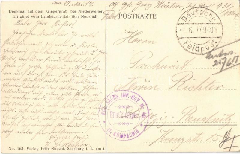 1917 Schlacht b. Saarburg i. L. 18-20. Aug. 1914. Denkmal auf dem Kriegergrab bei Niederweiler. Errichtet vom Landsturm-Bataillon Neustadt / WWI German military monument