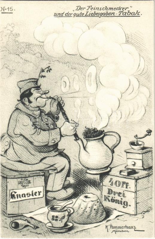 Leírás: Der Feinschmecker und der gute Liebesgaben-Tabak / WWI German military art postcard, smoking, humour. Nr. 1015. s: K. Pommerhanz (Rb)