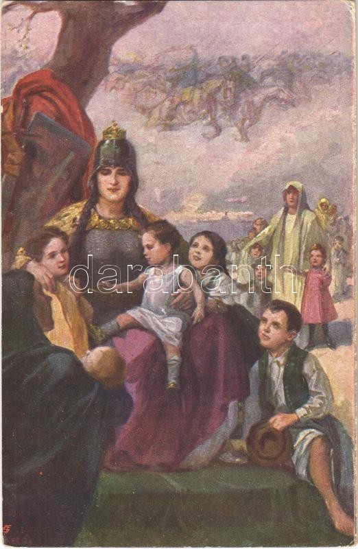 Fölszárítom az özvegyek és árvák könnyeit! A m. kir. honvédelmi minisztérium hadsegélyező hivatala kiadása / WWI Austro-Hungarian K.u.K. military art postcard, patriotic propaganda, support fund (EK)