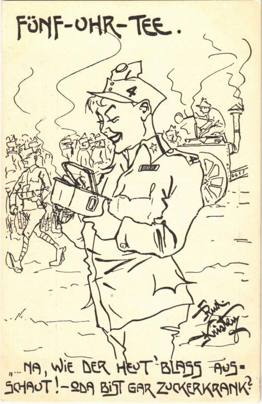 Fünf-Uhr-Tee / WWI Austro-Hungarian K.u.K. military art postcard, support fund. Deutschmeister Witwen- und Waisen-Stiftung (Aktion im Felde) Nr. 35. s: Rud. Kristen (EK)