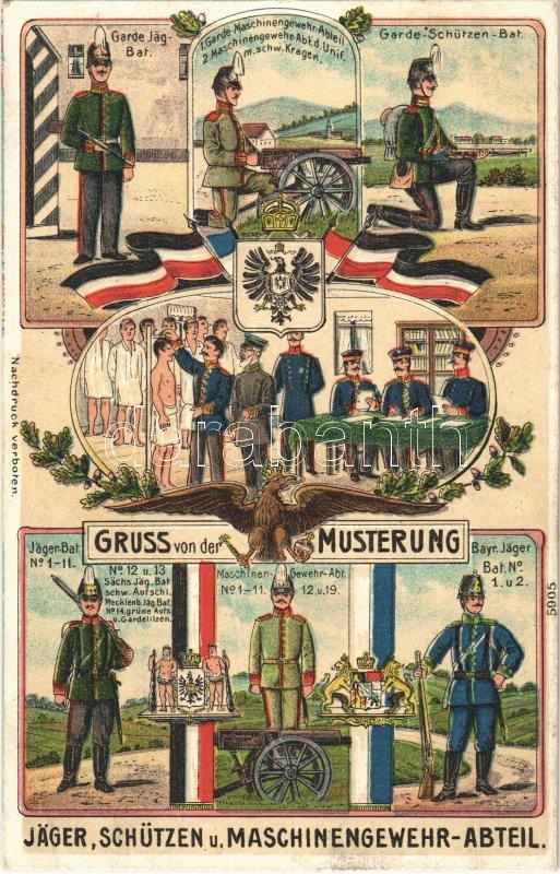 Leírás: Gruss von der Musterung: Jäger, Schützen u. Maschinengewehr-Abteil / German military art postcard. Art Nouveau litho