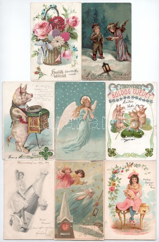 Leírás: 41 db RÉGI hosszúcímzéses motívum képeslap: üdvözlő, litho és dombornyomott is / 41 pre-1910 motive postcards: greetings. litho and embossed too