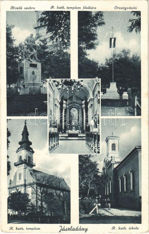 Leírás: 1940 Jászladány, Hősök szobra, emlékmű, Római katolikus templom, belső, főoltár, Római katolikus iskola, Országzászló (EK)