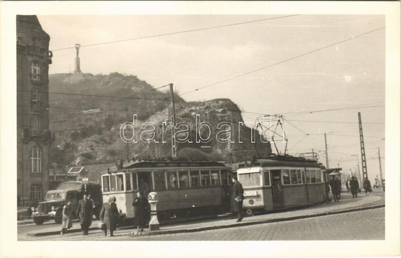 Leírás: Budapest XI. Szent Gellért tér, Szabadság szobor, Gellért szálló és barlangtemplom a háttérben, 9-es és 18-as villamosok, automobil. photo