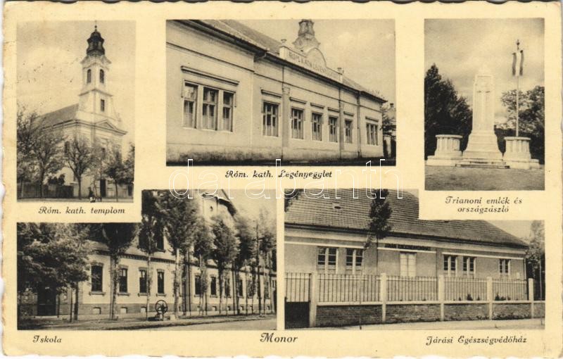 Leírás: Monor, Római katolikus templom és legényegylet, Trianoni emlékmű és Országzászló, Iskola, Járási Egészségvédőház