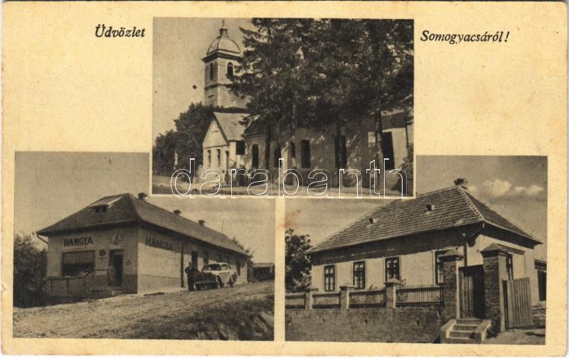 Leírás: Somogyacsa, templom, Hangya üzlete és saját kiadása, automobil (Rb)