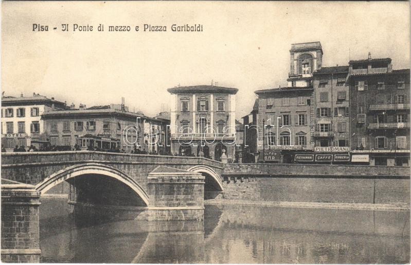 Leírás: Pisa, Il Ponte di mezzo e Piazza Garibaldi / bridge, tram, hotel, café, restaurant (EK)