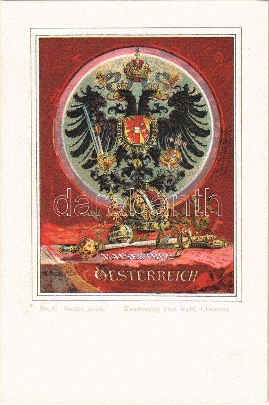 Leírás: Kaiserthum Österreich. Verlag von Paul Kohl No. 8. / Coat of arms of the Austrian Empire. litho