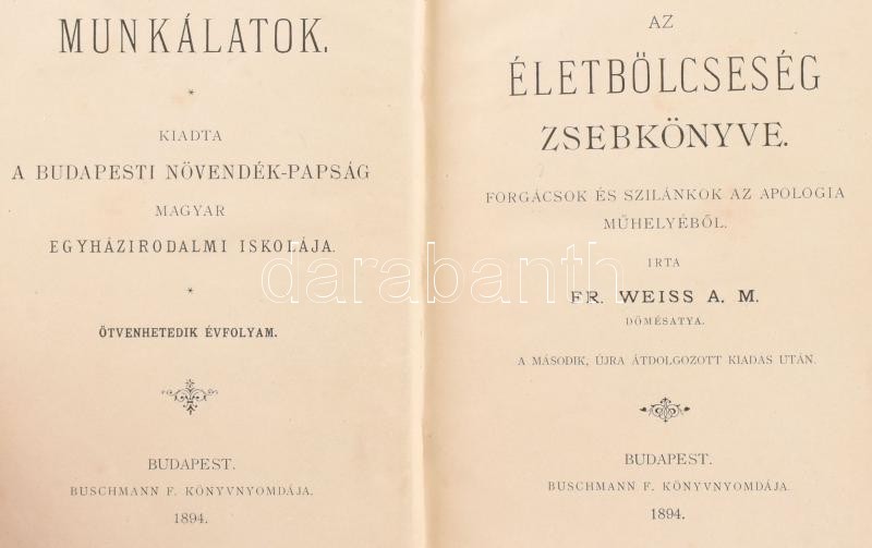 FR. Weiss A. M.: Az életbölcseség zsebkönyve - Forgácsok és szilánkok az apologia műhelyéből. Bp., 1894, Buschmann F. Könyvnyomdája. Kiadói félvászon kötés, kissé kopott gerinccel.