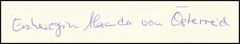 Alexandra von Habsburg-Lothringen, szül. Von Wrede (1979-) autográf sorai és aláírása kártyánn, lapra rögzítve (nem ragasztva), feliratozva holland nyelven. / Alexandra von Habsburg-Lothringen, szül. Von Wrede (1979-) autograph lines and signature on a card, mounted (not glued) on a piece of paper, with description in Dutch languague.
