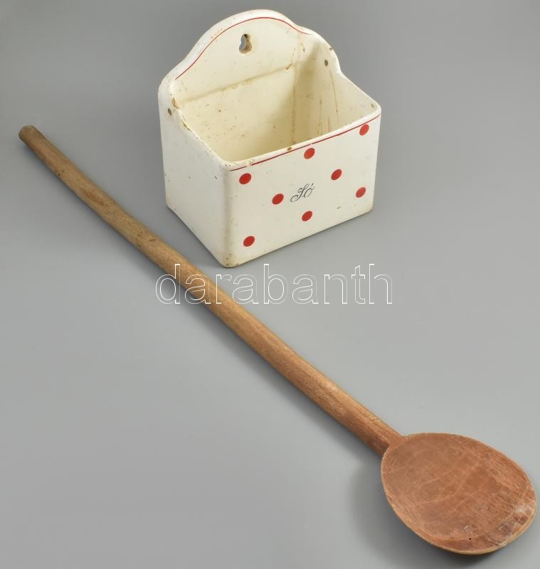 A somogyi tanyasi-csárdai világhoz kapcsolódó két eszköz: böllérlapát, fából, 61 cm, Gránit piros pöttyös fajansz fali sótartó, jelzett, lepattanásokkal. 15x20 cm