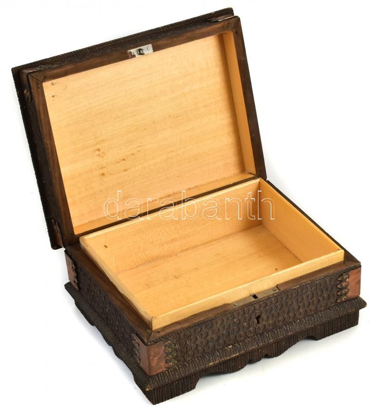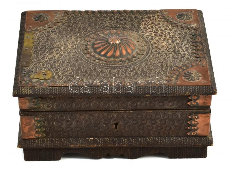 Leírás: Fa díszdoboz rézlemez veretekkel, egyik veret hiányzik, kulcs nélkül, apró kopásnyomokkal, m: 9 cm, 15x19 cm