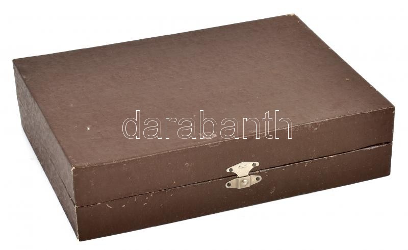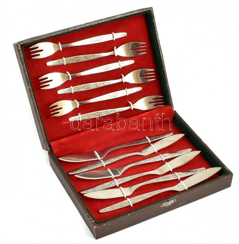 Leírás: Halas villa és kés szett, 6+6 db, fém, orosz vagy szovjet, jelzett, szövettek bélelt dobozban, villa h: 17 cm, kés. h: 20,5 cm