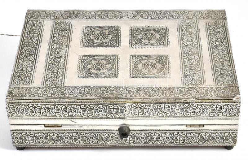 Leírás: Indiai ezüstözött ékszeres doboz, sérülésekkel, 27×21×8 cm